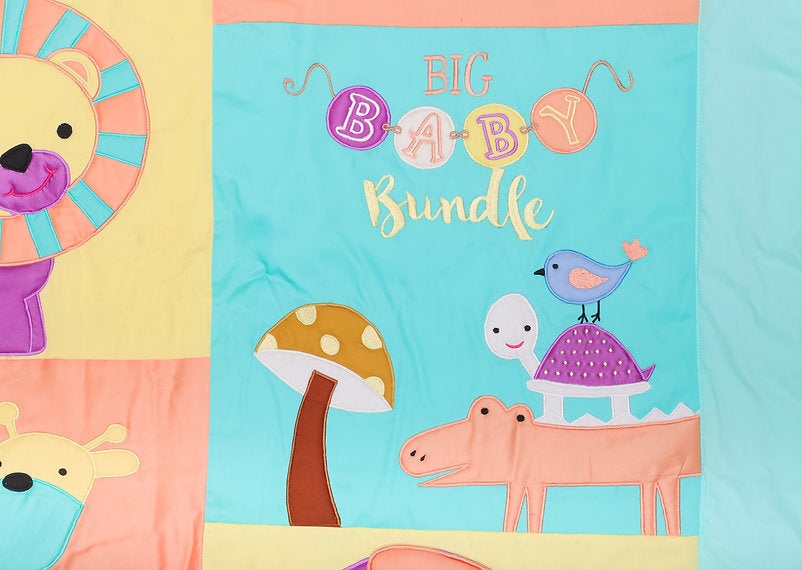 Let your little one live in the magical animal kingdom and enjoy a jungle safari in his dreams. Animals R my Playmates Quilt is designed as an everyday story-telling tool where the motifs can be used a picture card and enable learning with fun at sleep time for your little animal-lover.The pastel sea green with hints of peach and yellow is sure to fill your nursery with soothing hues. The quilt is filled with synchronised fibre which is known to retain warmth, is light-weight and never splinters to avoid any form of allergies to your sweet-one.You can team this quilt with matching accessories like a travel cushion-cum-quilt, bath towel, doctor file, storage pouches etc to complete your nursery in a single theme. All the items can be personalised to name as well.