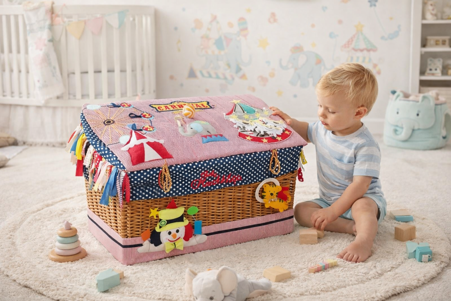 - Specially handmade and handcut embellishments with 3-D effects with a “play and learn” stimulus. Please note, that these may change with each basket as we are not mass produced and recreate a unique piece everytime just for you.